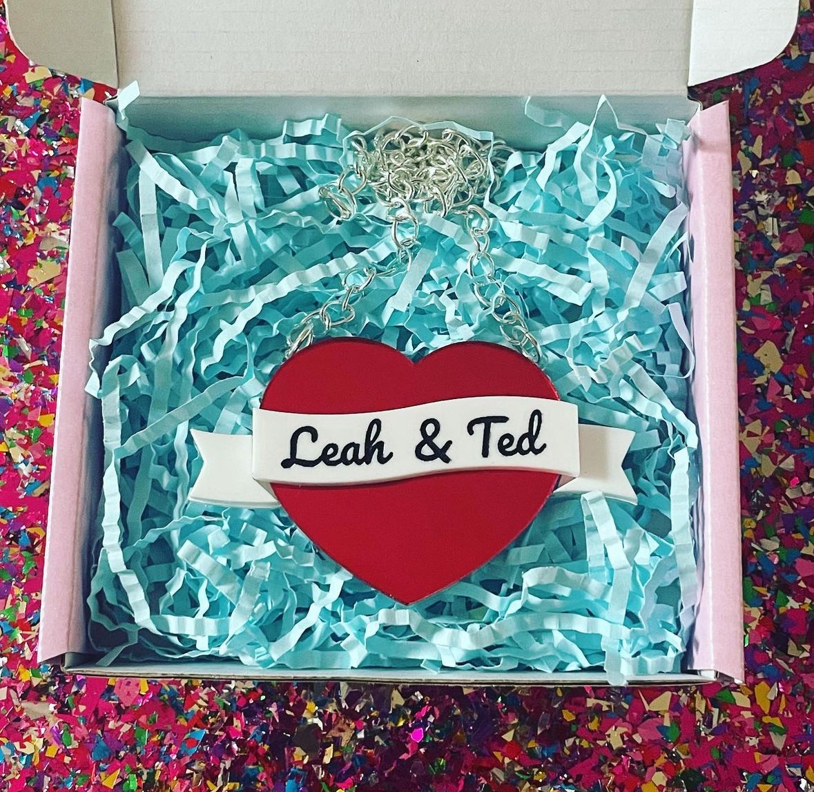 Made from red mirrored acrylic and white acrylic with black painted wording. The word on the banner of the heart can be customised – please send me a message or let me know in the comment box at check out what you’d like it to say.